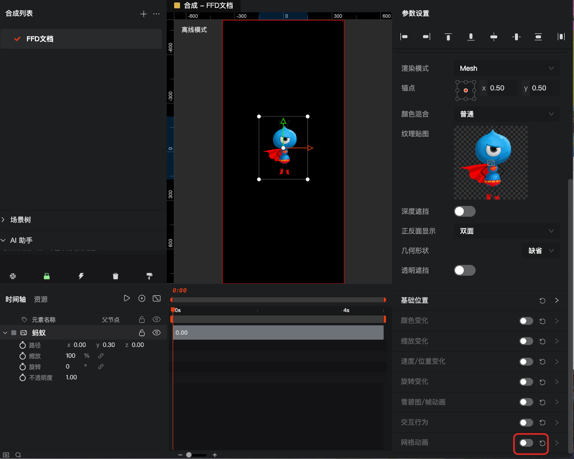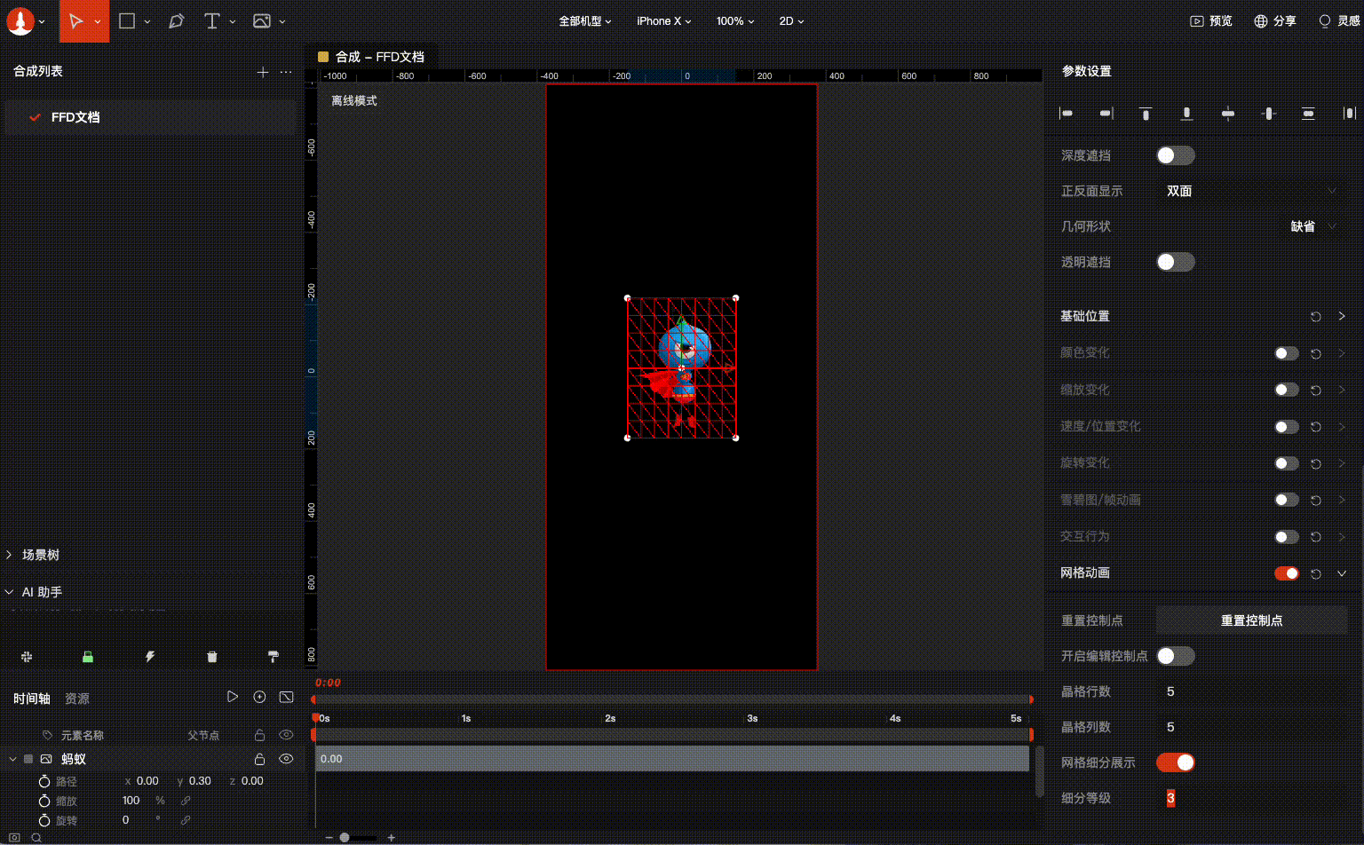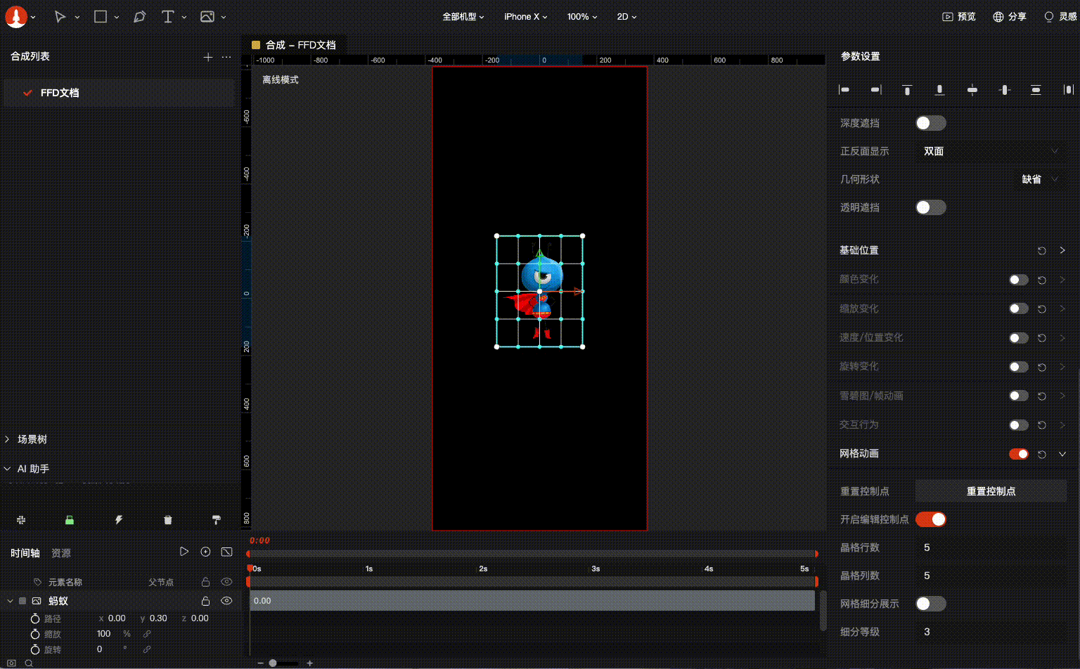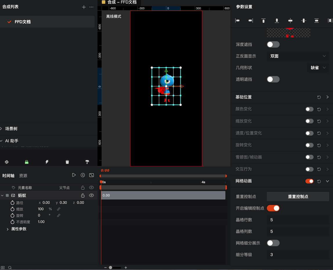 可以通过 网格动画(后简称 FFD)来对静态图层做一些变形动画。