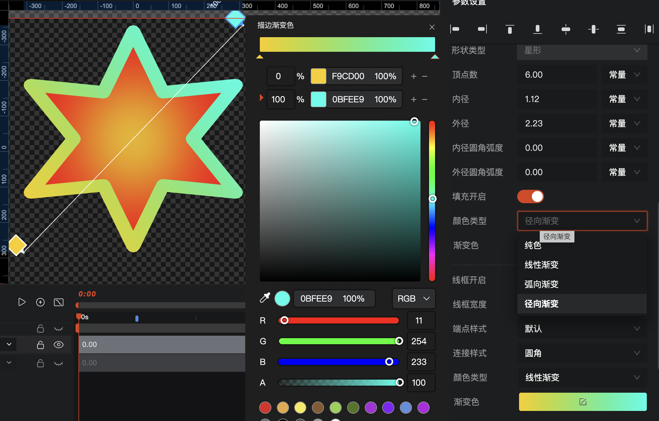 在时间轴上对渐变的类型、方向、中心点、颜色节点进行 K 帧。这意味着你可以创造: