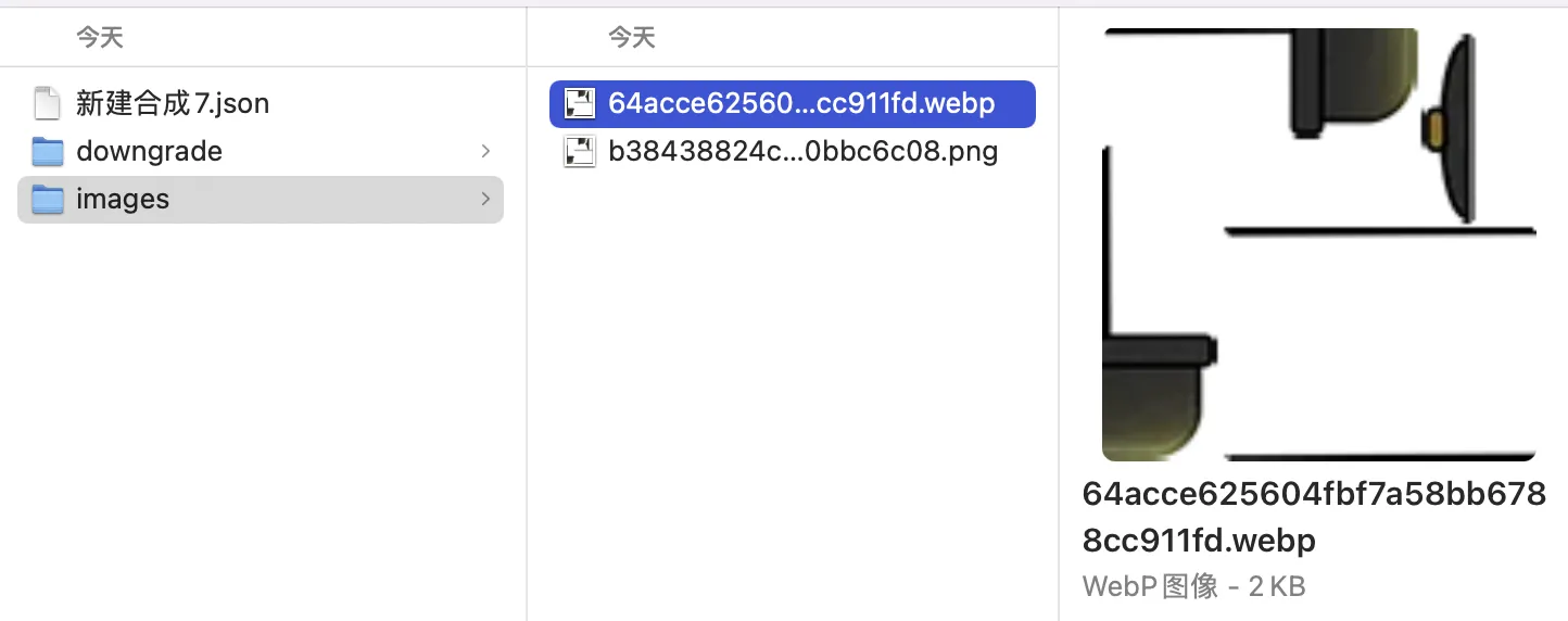 images:图片资源,上面为一张 WebP/PNG 图片。图片通常为合并后的、类似于雪碧图的图片。GE 运行时会优先加载 WebP 图片。如果有其他格式的资源,还会包含其他目录比如spines。downgrade:此目录中文件为一张降级图片。当 GE 运行时播放发生错误时(比如设备不支持 WebGL )将会触发onError,此时可以展示降级图作为兜底手段。一般来说,GE 正常播放的覆盖率约为 95%。