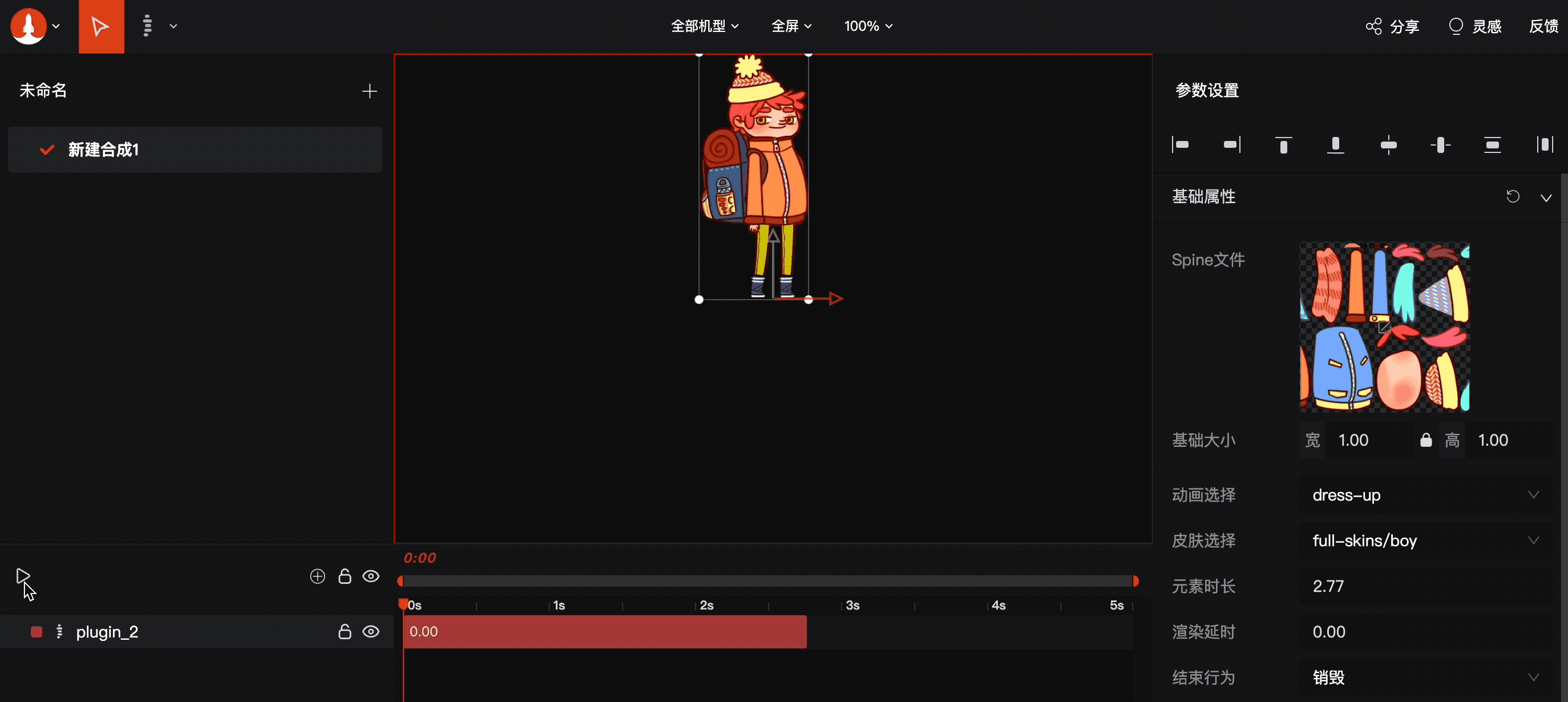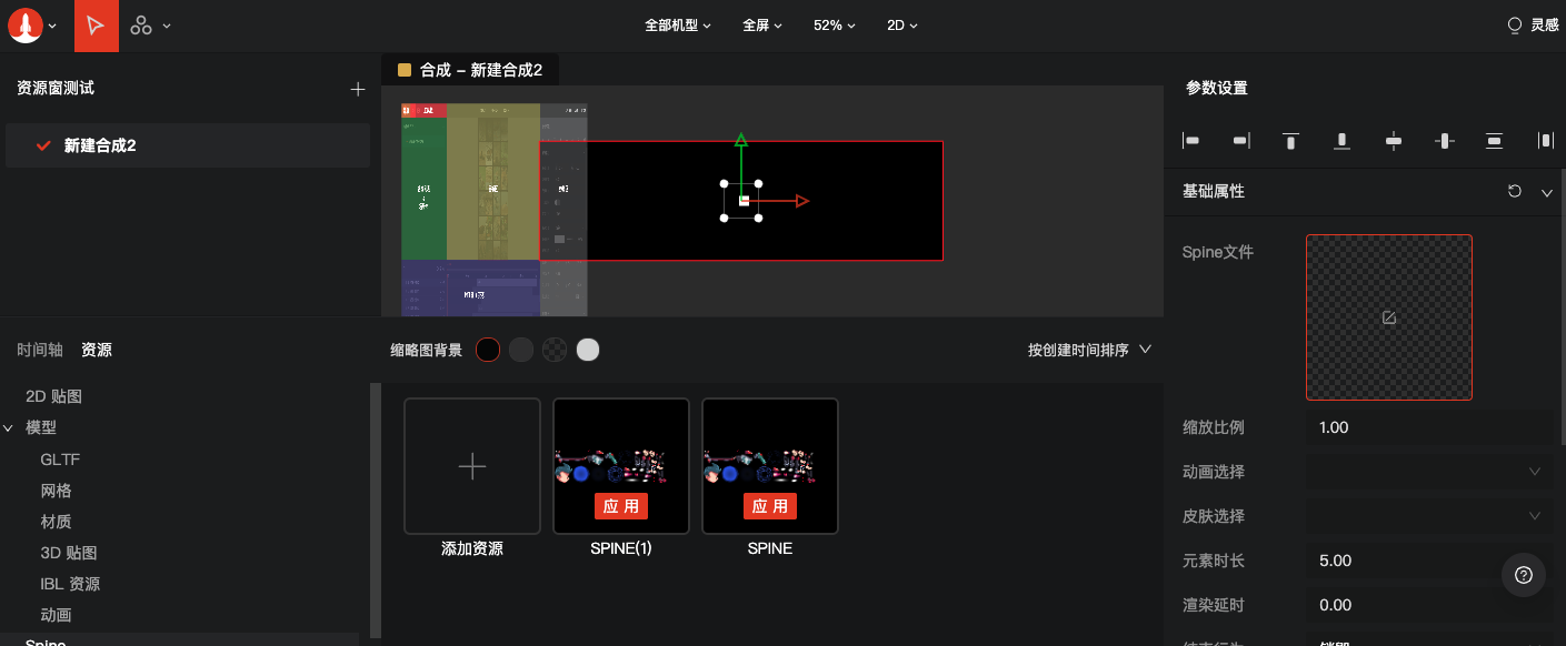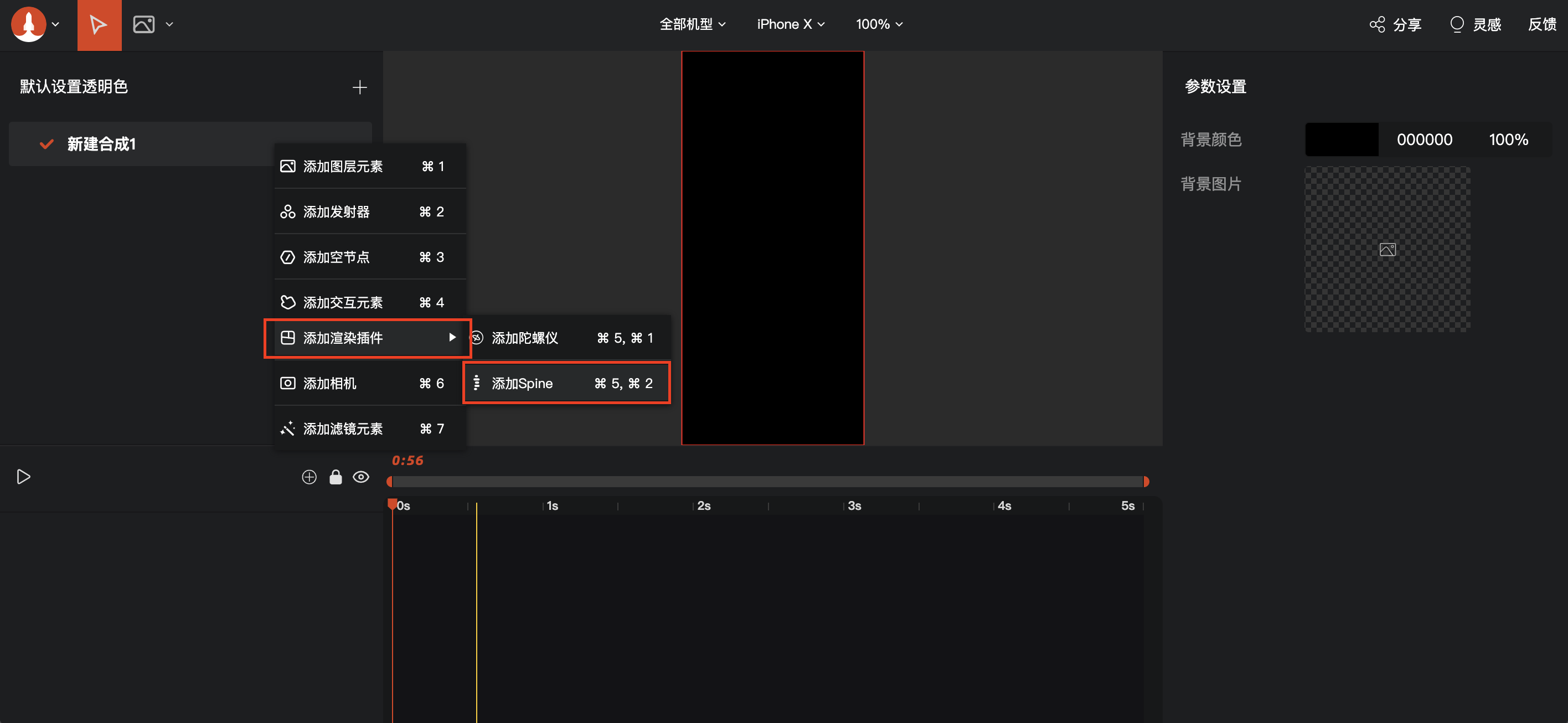 通过【添加渲染插件】-【添加 Spine】,在画布中添加一个Spine 元素。