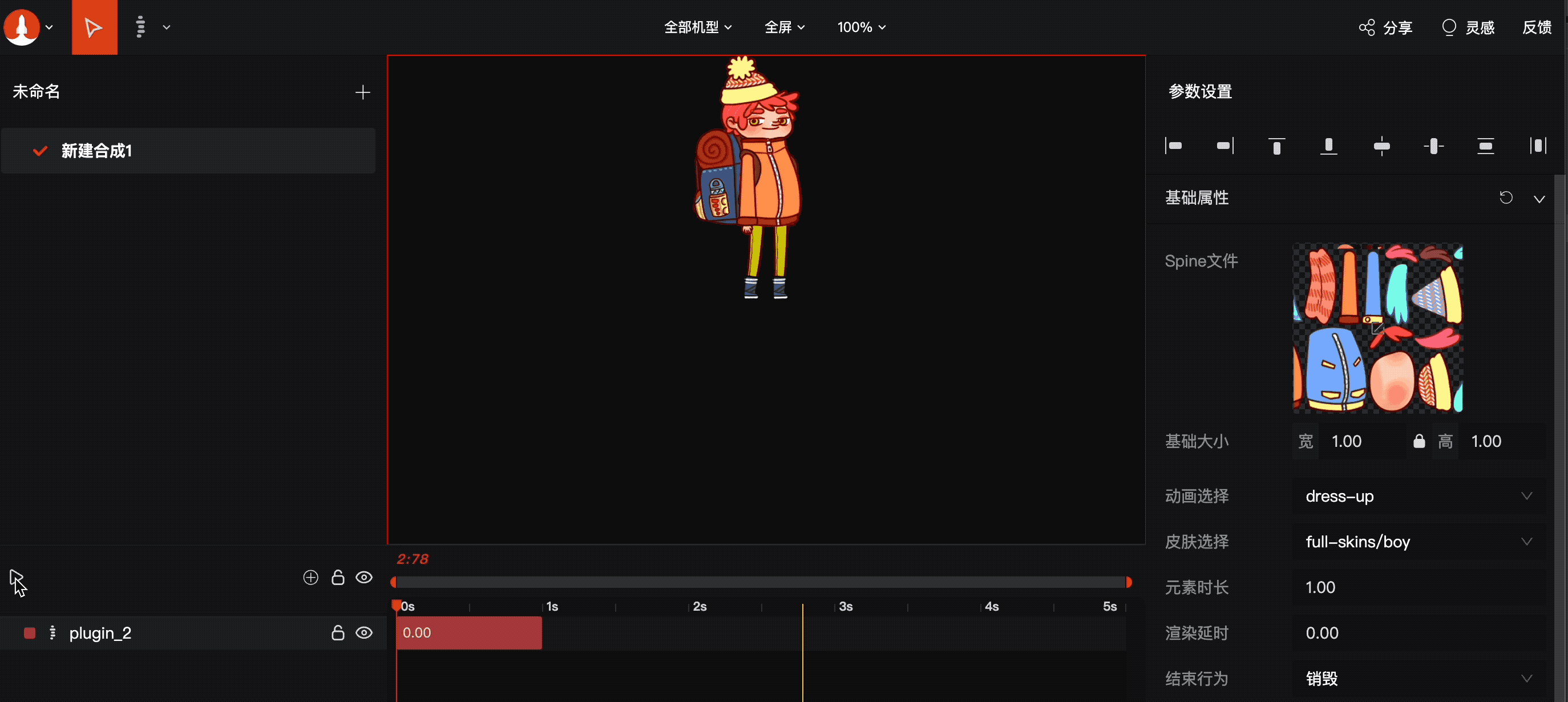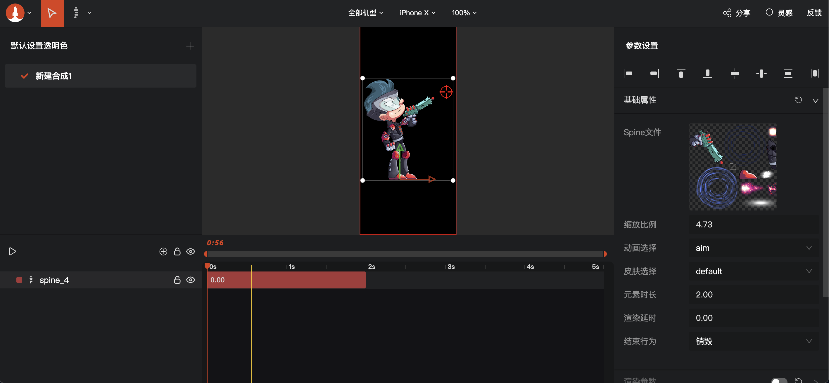 - 元素时长:可以通过【元素时长】调整 Spine 元素的动画速度。一个原本 2 秒的动画,将元素时长设置为 1 秒,动画速度加快 100%。反之,如果将动画时长拉长,则动画速度减慢。