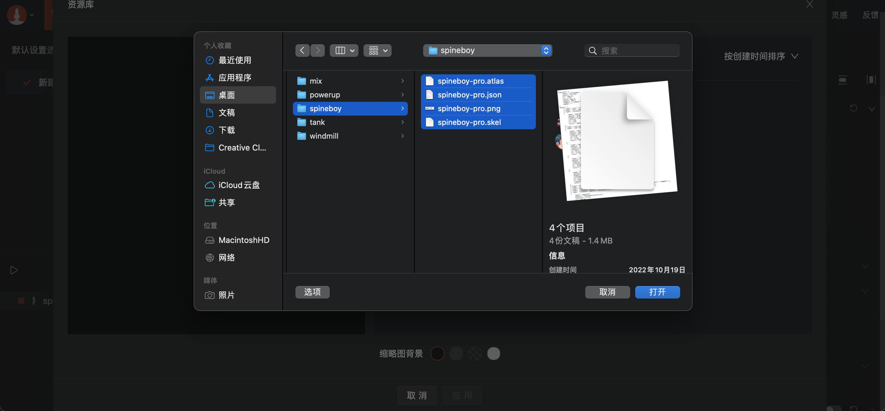 - 同批上传一个 Spine 文件的【贴图.png】+【骨骼.skel】+【描述文件.atlas 或 .json】,如下图所示。其中,atlas 和 json 等价,所以上传【.atlas + .json】或上传其中一个均可。