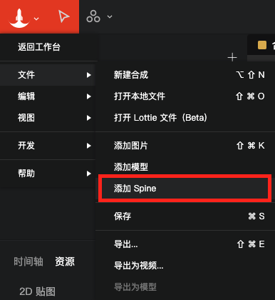 - 文件 - 添加 Spine:文件菜单下,选择添加 Spine,即可向当前项目,添加 Spine 文件。