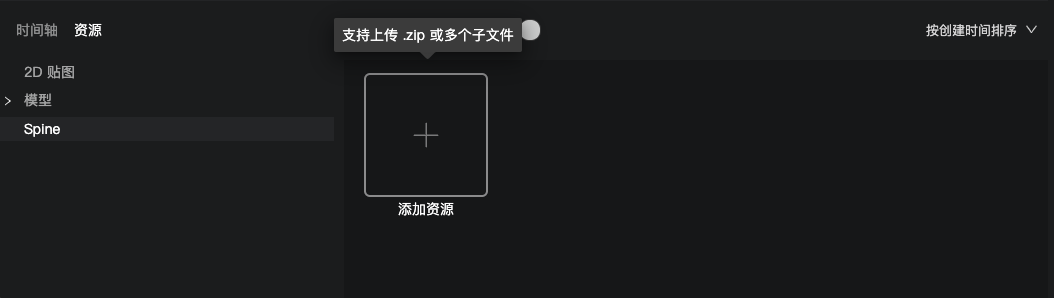 - 资源 - 上传:在【资源】中,选择 Spine 分类,点击【+】号,即可向当前项目,添加 Spine 资源。