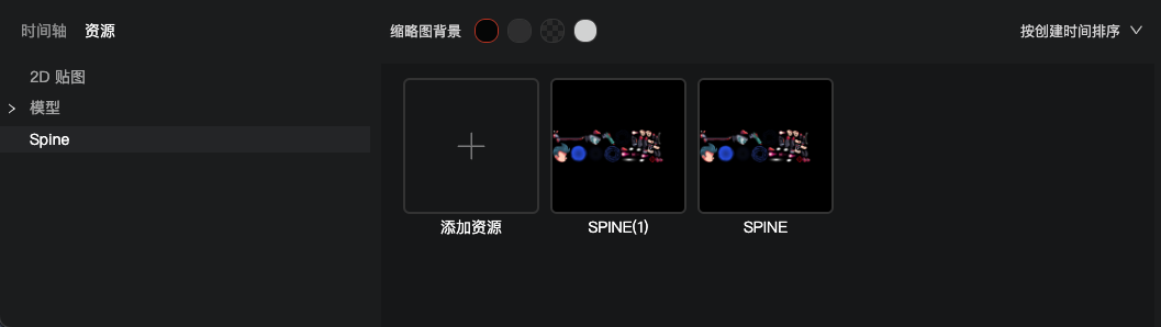 - 资源 - 拖拽添加:在【资源】中,选择 Spine 分类,直接将文件拖拽添加到【资源】,即完成添加。