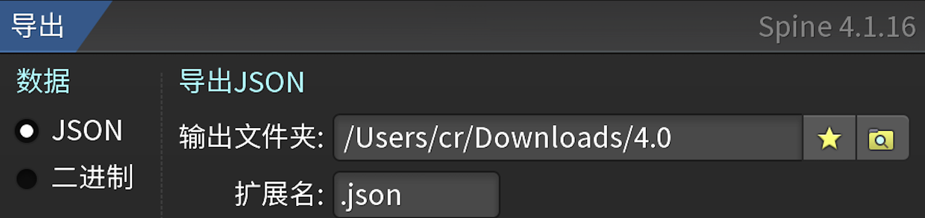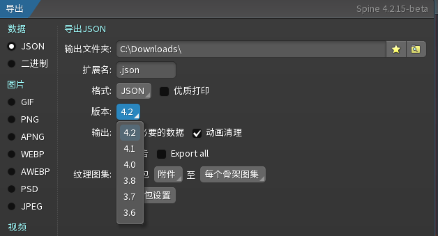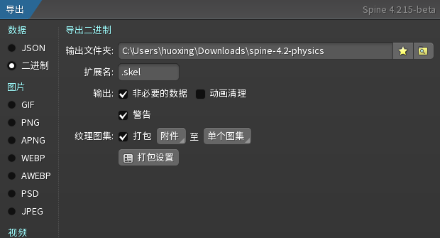 若选择二进制格式,请保证 Spine 软件的版本为 4.2 及以上,扩展名填写 .skel。
