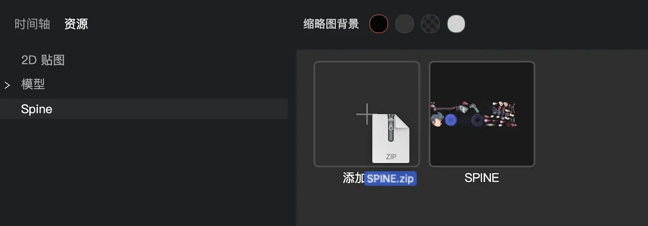 上传到 Galacean Effects 的 Spine 文件会以贴图为缩略图展示在【资源】-【Spine】分类下。