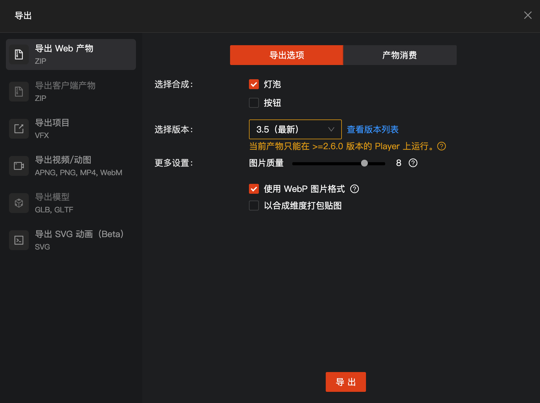 在左侧的功能列表中选择“导出 Web 产物”,然后在右侧的设置面板中选择合成(默认会选中主界面合成列表中当前选中的合成),最后点“导出”。