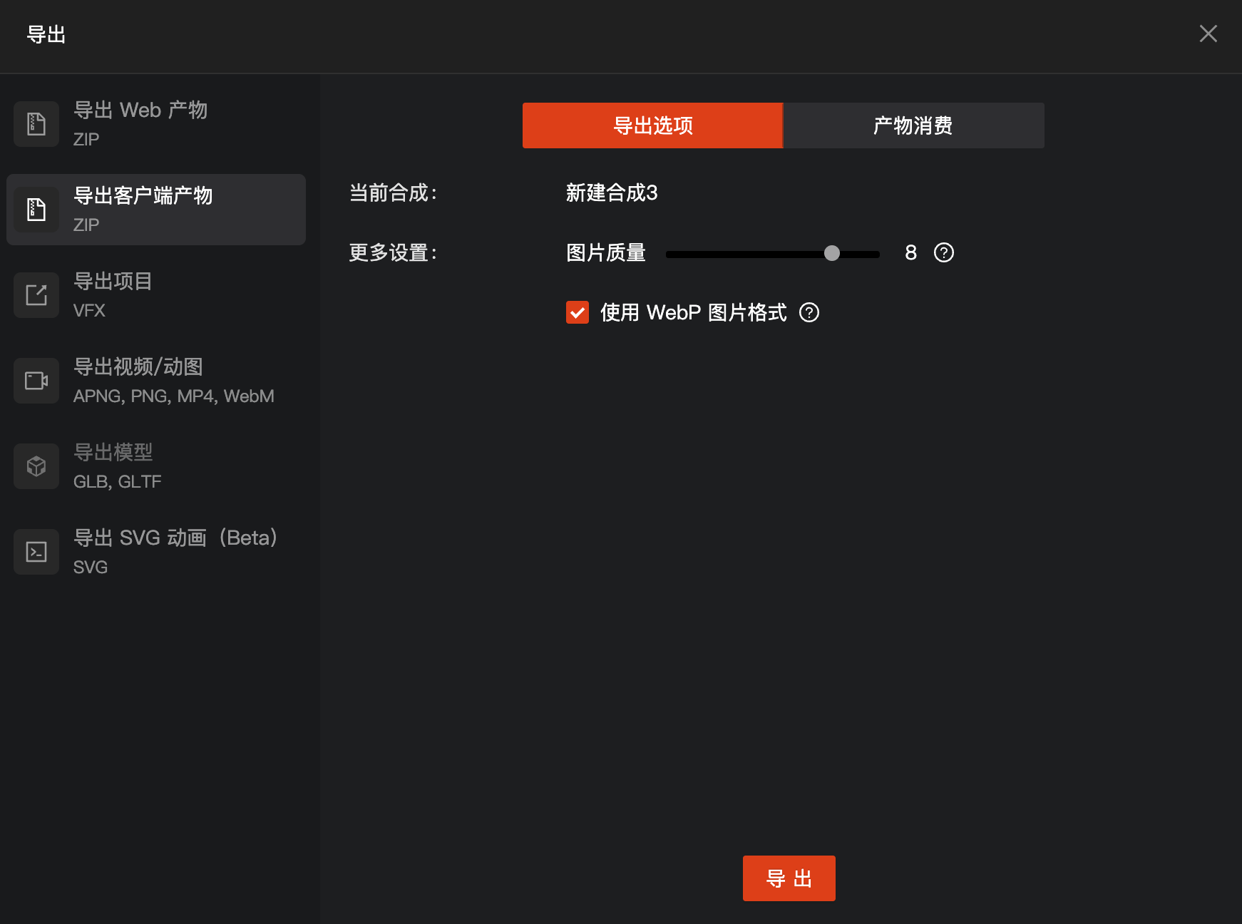 交付 Native 客户端产物,请点击左侧功能列表的“导出客户端产物”,选择合成后,点“导出”。设置中的参数意义与“导出 Web 产物”一致。