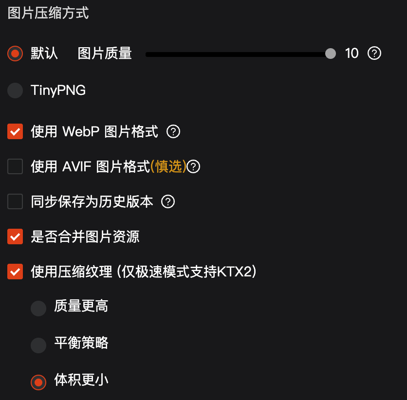 在发布时,使用极速发布并勾选“使用压缩纹理”: