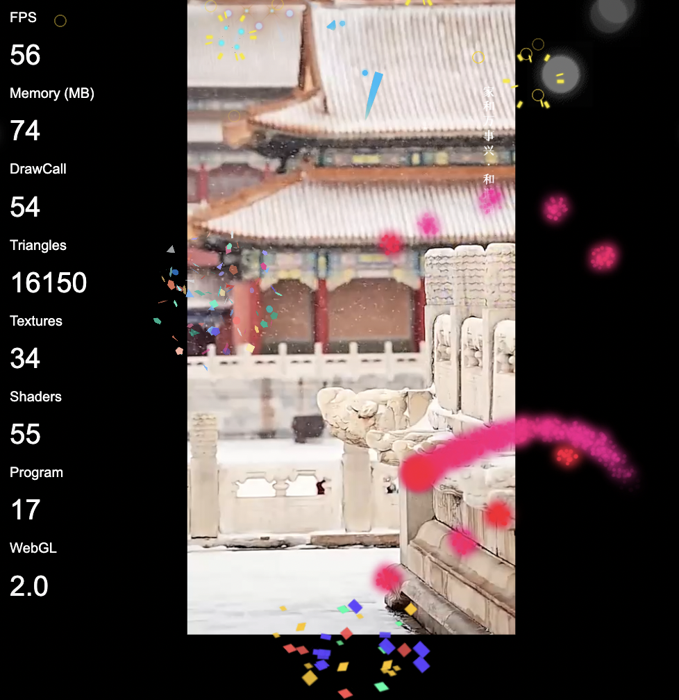 如上图所示,从上到下分别表示帧率、内存占用(真机不生效)、绘制调用、三角面数、图片数量、Shader 数量、渲染程序数量、WebGL 版本(通常主要关注前四项)。画面稳定性看帧率,当帧率小于 30 时,画面会出现明显卡顿。其他不做强制要求,当然也是数量越少对动效流畅度越友好,当出现卡顿时,可以选择减少粒子数量、图层数量等缓解。